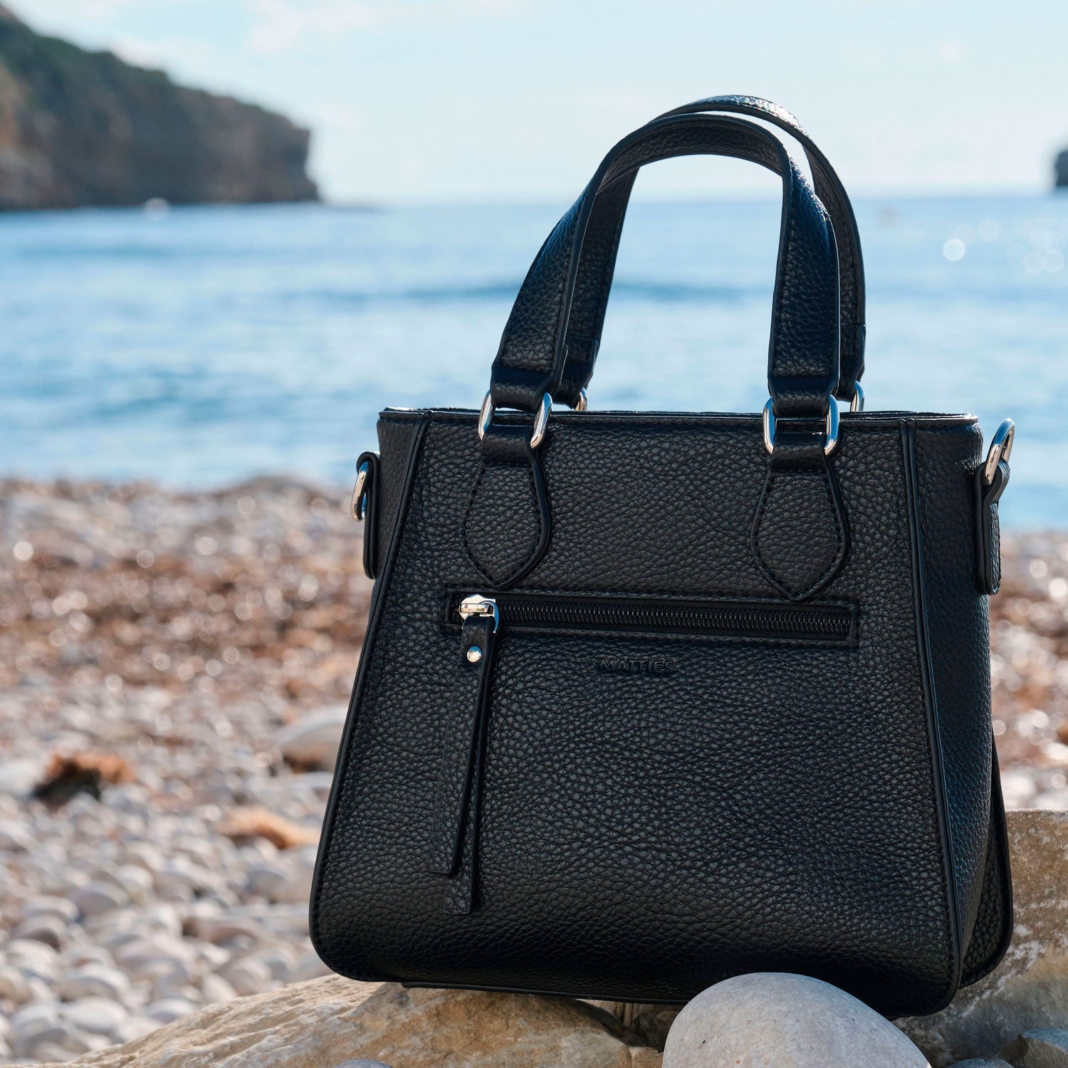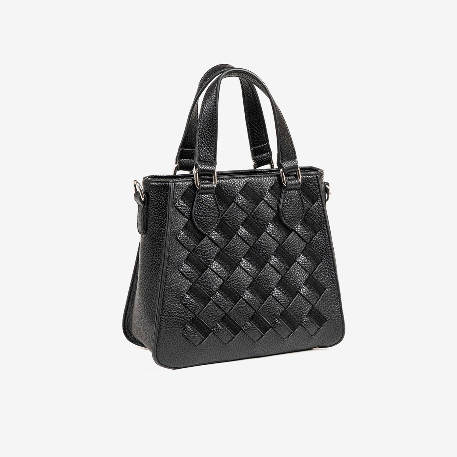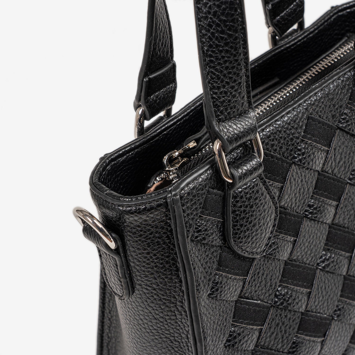 Bolso de mano con bandolera, color negro, serie roquetas. Acabado en polipiel de alta calidad. Interior de forro textil con un bolsillo cerrado con cremallera. En la parte trasera tiene un bolsillo cerrado con cremallera. Tiene doble asa de mano. El asa auxiliar tipo bandolera cuenta con mosquetones para su fácil colocación.