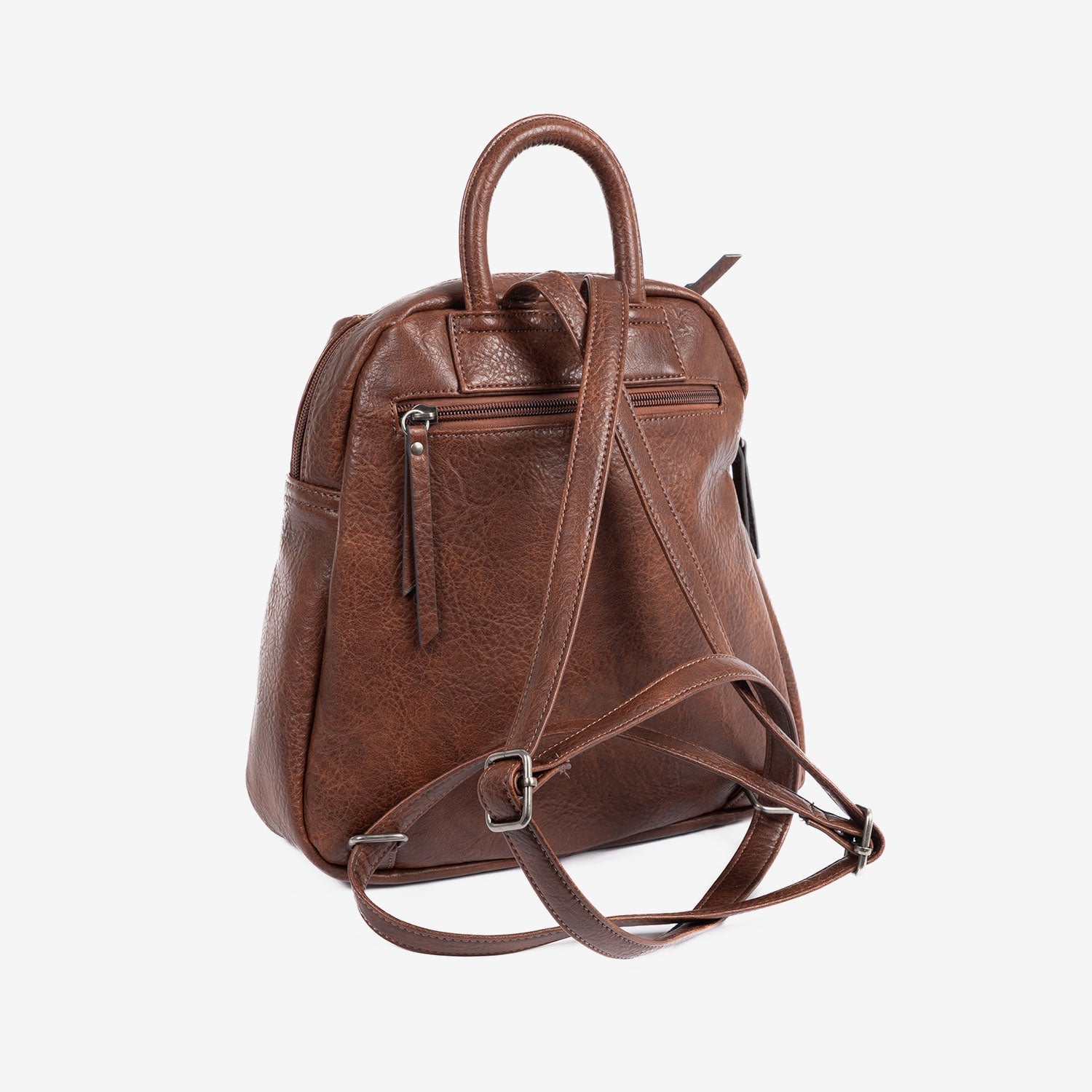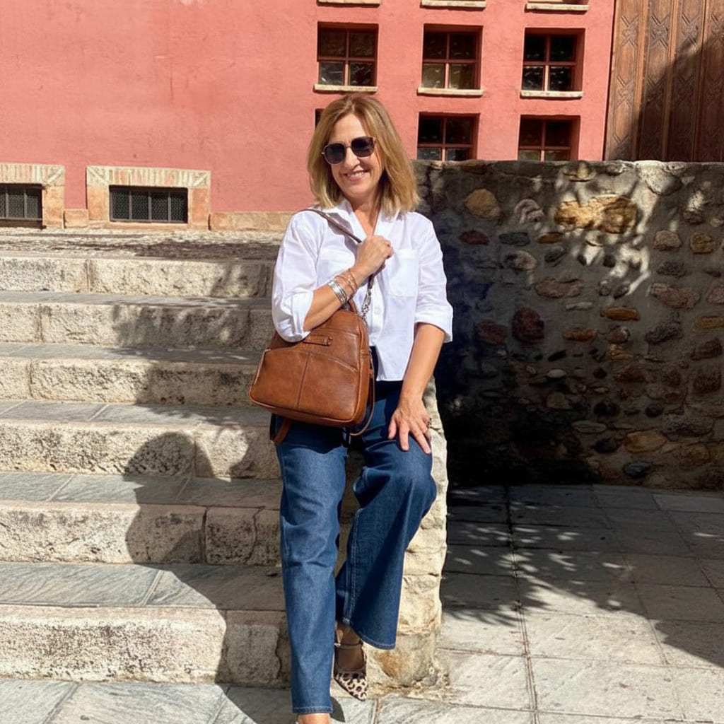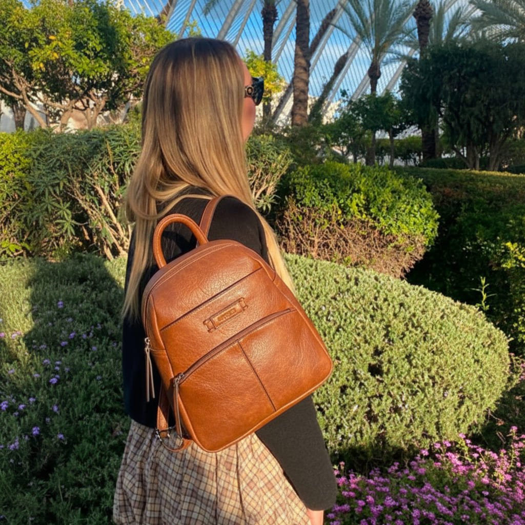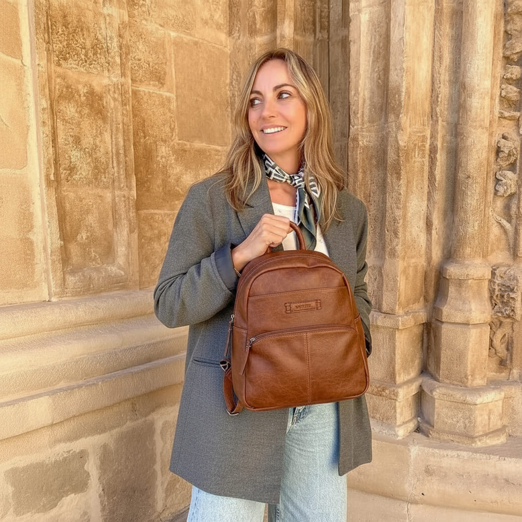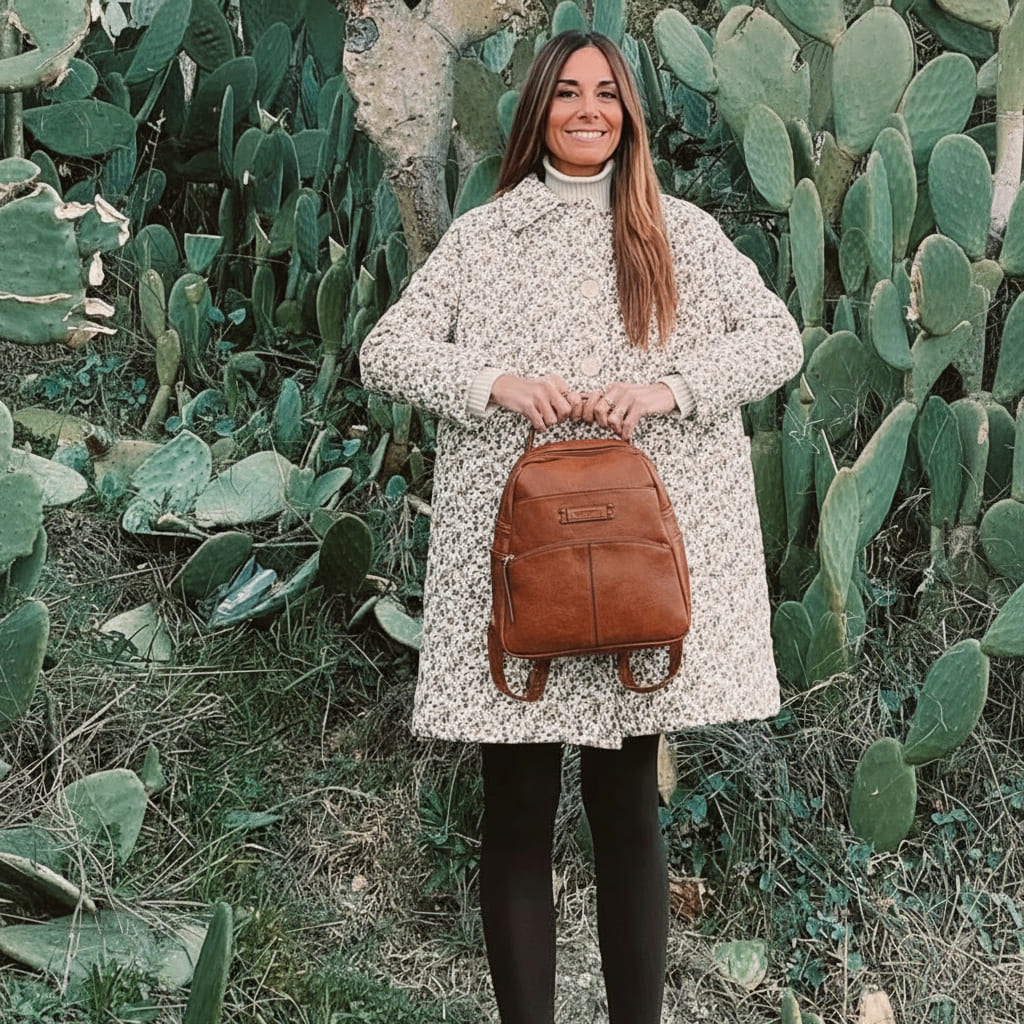 La Mochila Rutina Diaria Matties nació de una idea sencilla: llevar lo de cada día sin cambiar de bolso ni perder tiempo buscando. Por eso es compacta y ligera, pero rinde: compartimento principal con cremallera para agenda pequeña, gafas y monedero; bolsillo delantero para móvil y llaves; y bolsillo trasero con cremallera para lo valioso cuando vas en metro o de paseo. Su tamaño mediano (26×27×12 cm) no abulta y las asas ajustables y asa superior te dan comodidad en cualquier plan. Hecha en polipiel de alta calidad con acabado piel e interior forrado, diseñada en España para durar y combinar: el tono terracota eleva tus básicos y se integra con todo. Orden, seguridad y un estilo que te acompaña sin ruido. Menos rebuscar, más vivir.