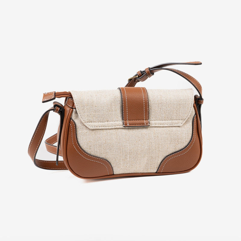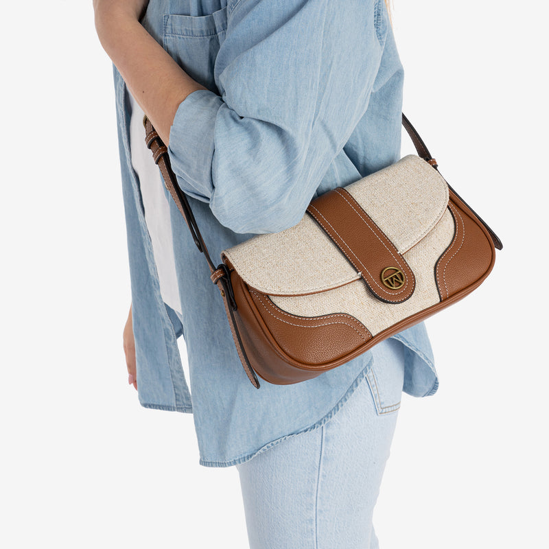 Bolso de mujer, color cuero, serie gador. Acabado en lona/polipiel de alta calidad. Interior de forro textil con un bolsillo cerrado con cremallera. El asa es tipo bandolera y tiene hebilla para su fácil ajuste en altura.