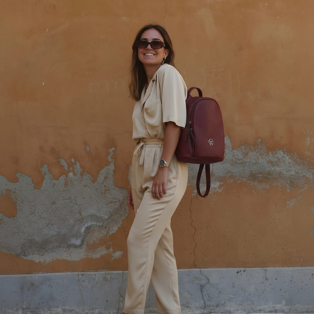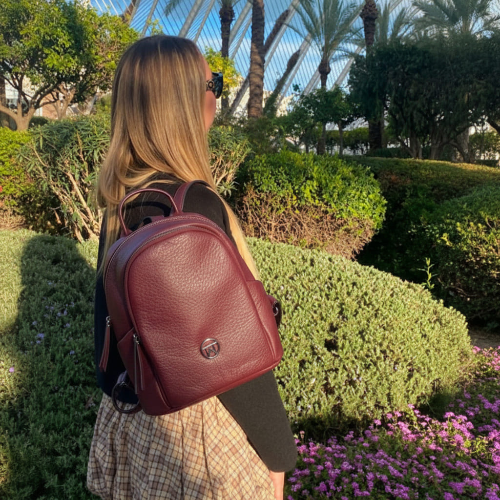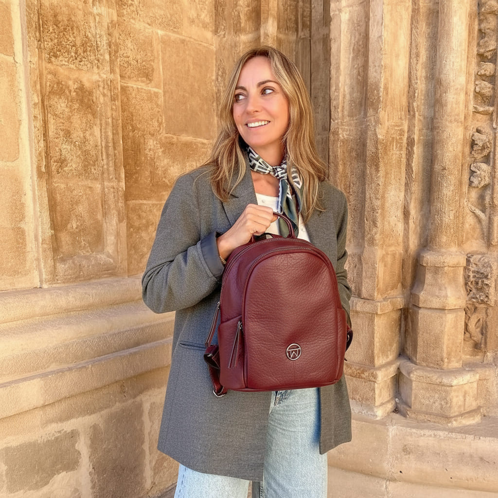 La Mochila Esencia Velvet nació para las que quieren color sin estridencias: un burdeos elegante que viste igual de bien unos vaqueros que un vestido. Por fuera, limpia y femenina; por dentro, práctica de verdad: doble compartimento con cremallera para separar agenda y neceser, bolsillo trasero para lo valioso cuando vas en metro y bolsillos laterales para lo que usas a cada rato. Su tamaño grande (27×30×12 cm) aprovecha el espacio sin abultar, el interior forrado cuida tus cosas y las asas ajustables con asa superior te dan comodidad en cualquier plan. Fabricada en polipiel de alta calidad con acabado piel, diseñada en España para acompañarte de lunes a domingo. Te verás ordenada, segura y con ese punto sofisticado que levanta el día. Menos dudas, más estilo.